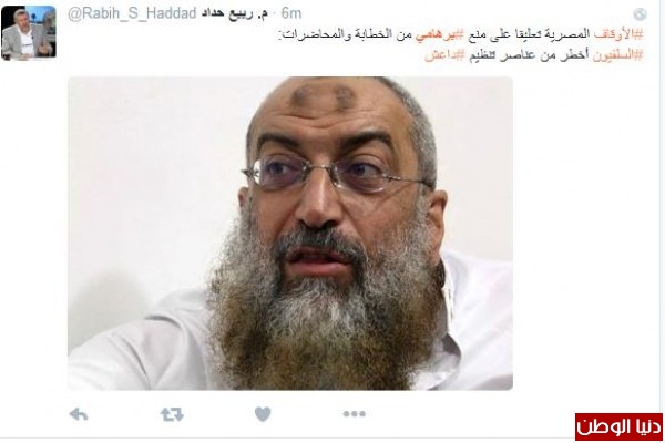 تصدّر الشيخ السلفي ياسر برهامي منصة تويتر في مصر للمرة الأولى ، جاء ذلك بعد أن منعت وزارة الأوقاف المصرية برهامي من الخطابة وإلقاء الدروس بمساجدها، بعد أن منع السلفيين أحد خطباء الأوقاف من اعتلاء المنبر في الاسكندرية الجمعه ، فيما علّقت الأوقاف أن السلفيون أخطر على مصر من داعش.