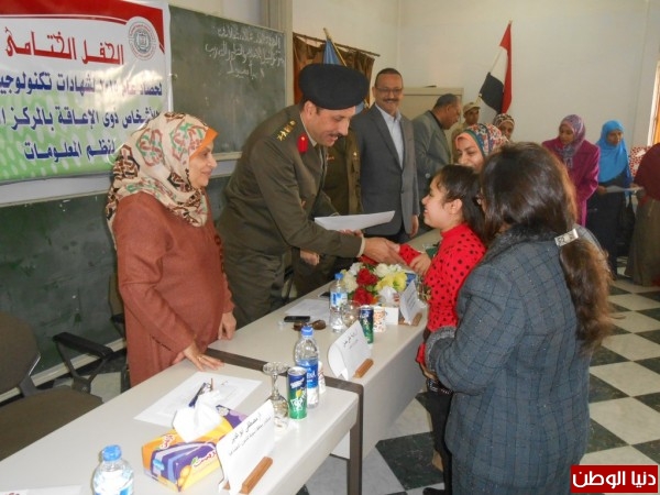 جاء ذلك خلال كلمته التى القاها نيابة عن اللواء اركان حرب يحيى طه الحميلى قائدالمنطقة الجنوبية العسكرية خلال الاحتفالية التى اقيمت بمركز النيل للاعلام بمدينةاسيوط اليوم بمناسبة ختام حصاد عام 2015 للمركز وتم خلالها تكريم 60 شاب وفتاة منذوى الإعاقة من الحاصلين على شهادات فى مجال تكنولوجيا المعلومات بالمركز نظرالتفوقهم وأدائهم المتميز خلال فترة التدريب وبعض اولياء الامور والمشرفين القائمينعلى المركز وبعض القيادات التنفيذية .