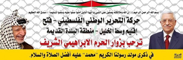 دعت حركة التحرير الوطني الفلسطيني " فتح " إقليم وسط الخليل جماهير محافظة الخليل للمشاركة بفعاليات احياء ذكرى المولد النبوي يوم الخميس الساعة العاشرة في المسجد الابراهيمي ،والدعوة للصلاة يوم الجمعة ، ومن المتوقع أن يكون المسجد مفتوح بكافة أروقته يوم الخميس ، وعليه طالبت الجميع انتهاز هذه الفرصه لزيارة الأقسام التي تقع تحت سيطرة الاحتلال ،بعد تقسيمه عقب مجزرة الحرم الابراهيمي الشريف ، وشددت بأهمية تعزيز الهوية الوطنية الفلسطينية والتأكيد على عروبة المقدسات كافة والحق بالوصول لاماكن العبادة وممارسة الشعائر الدينية والمقدسة لنا في كل مكان وأي زمان ، ومع التنديد بالتقسيم المكاني والزماني لسياسة الاحتلال في المقدسات ودور العبادة .