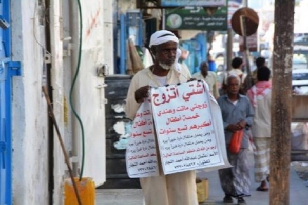 أثارت صورة لرجل عجوز يتجول في شوار مدينة المكلا عاصمة محافظة حضرموت في اليمن، معلقًا على جسده لافتة قماشية يبحث من خلالها عن زوجة، جدلا واسعا على مواقع التواصل الاجتماعي.