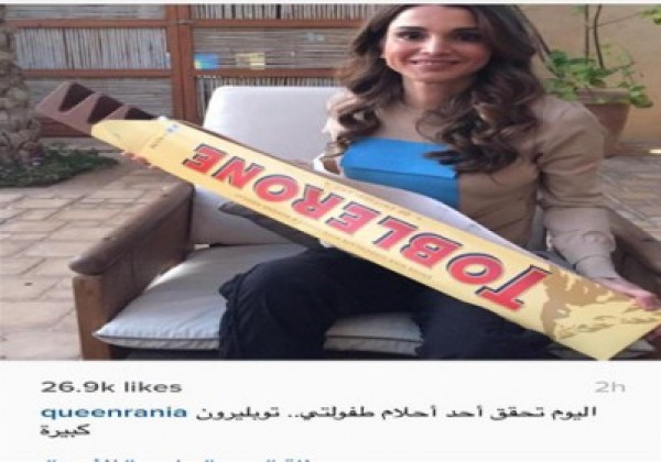 والتقطت جلالتها الصورة مع لوح كبير لشوكلاتة 'توبولريون' وهي احدى اشهر الماركات العالمية والتي لها محبون من مختلف دول العالم .