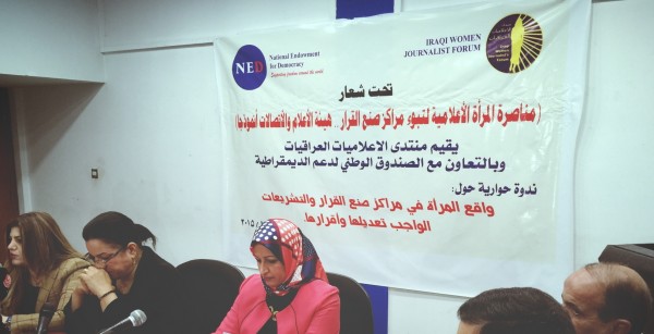 تحت شعار مناصرة المراة لتبوء مراكز صنع القرار..هيئة الاعلام والاتصالات انموذجا اقام منتدى الاعلاميات العراقيات وبالتعاون مع الصندوق الوطني لدعم الديمقراطيةNED) (ندوة حوارية ادارتها الزميلة حذام يوسف عبر محورين اساسيين هما، المحور القانوني وورقة بحثية مقدمة من الحقوقي اياد محسن ، والمحور الثاني حول مراجعة لواقع للمراة في مراكز صنع العراق قدمتها الدكتورة عاصفة موسى .