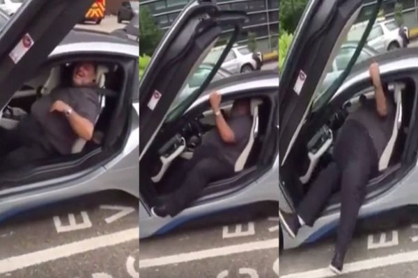 قام أحد أصحابه بتسجيل مقطع فيديو له، حيث ظهر وهو يواجه صعوبة بالغة للخروج من سيارته الـBMW، فيما دخل أصحابه في نوبة ضحك أثناء استنجاده بهم لإنقاذه، وظل الرجل يقاوم ويستخدم يديه لمساعدته في النزول، حتى نجح في النهاية.
