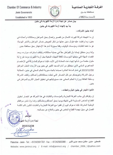 أنهت الغرفة التجارية والنقابات والمؤسسات في جنين أمس لقاءا لبحث الإجراءات التصعيدية ضد شركة الكهرباء في جنين.