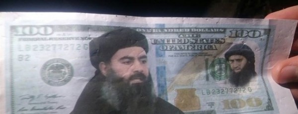 اكتشف اليوم الثلاثاء اسرائيلي من سكان كيبوتس "سديه اليعازر" في الجليل كومة كبيرة من اوراق نقدية من فئة 100 دولار امريكي عبارة عن صورة تحمل صورة خليفة "داعش" أبو بكر البغدادي وشعارات باللغة العربية تمثل رموزا لحركة "داعش".