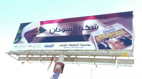 أزاحت حملتا "شكرا مملكة الحزم" و " شكرا إمارات الخير" الستار عن لوحة كبرى لفخامة الرئيس السوداني عمر حسن أحمد البشير بعنوان (شكرا السودان ) في عدن برعاية مؤسسة (الحقيقة) للإعلام ,ورفعت اللوحة في أهم شوارع العاصمة عدن بدوار السفينة .