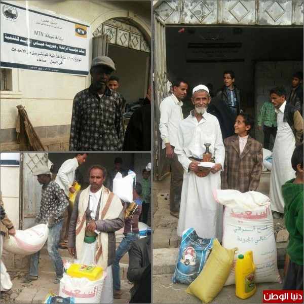 وزعت مؤسسة الرائدة حورية عباس المؤيد يوم الجمعة بصنعاء (100 سلة غذائية) مساعدة للأسر المتضررة من الاحداث في اليمن بدعم من شركة MTN يمن .