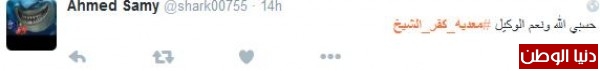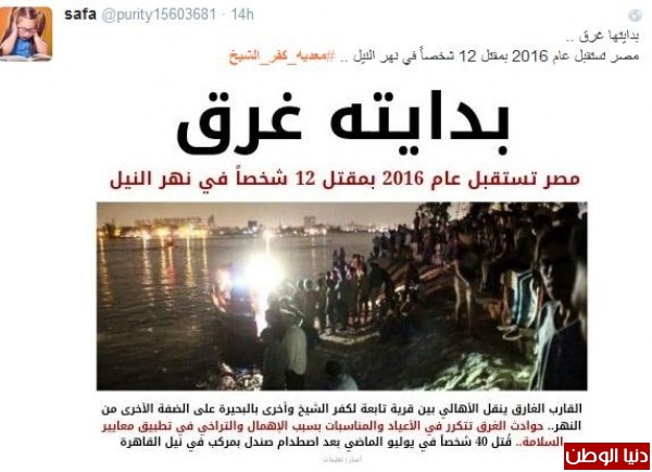 والى مصر التي شهدت مقتل 14 مواطنا في حادثة غرق معدية بكفر الشيخ بأول يوم من العام الجديد ، تصدّر هاشتاج معدية كفر الشيخ تويتر في مصر ليغرّد المصريون ما بين مطالب بمحاسبة المسؤولين والدعوة بالرحمة على المتوفين بالحادثة .