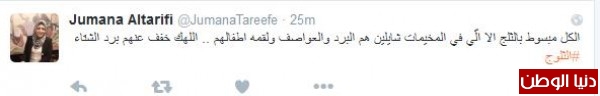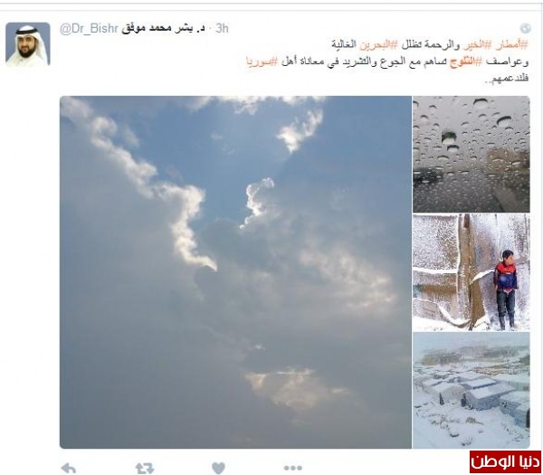 جمانة غرّدت :"الكل مبسوط بالثلج الا الّي في المخيمات شايلين هم البرد والعواصف ولقمه اطفالهم .. اللهك خفف عنهم برد الشتاء #الثلوج"، فيما غرّد الدكتور بشر:"#أمطار #الخير والرحمة تظلل #البحرين الغالية