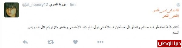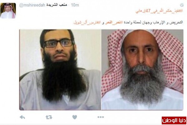 أحد السعوديين غرّد :"معتدأثيم يكفرالصحابه ويطعن بعرض ام المؤمنين ليتكم قصصتم لسانه قبل عنقه وحشوتم فمه تراب نال ما يستحق وسيرد الى ربه فيعذبه عذاب نكر #نمر_النمر"، وغرّد ماجد الماجد:"سعادتنا ب #تنفيذ_القصاص_علي_47_ارهابي