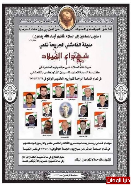 ارسل سيادة المطران عطا الله حنا رئيس اساقفة سبسطية للروم الارثوذكس اليوم تعازيه القلبية الحارة للكنيسة الارثوذكسية السريانية الشقيقة بإستشهاد 13 شهيدا سريانيا في القامشلي اثر عملية اجرامية ارهابية حدثت في ليلة رأس السنة الجديدة ، وقد تم تشييع جثامين الشهداء في كنيسة السيدة العذراء مريم للسريان الارثوذكس في القامشلي في شمال سوريا ، وقد ادان سيادته هذه الجريمة النكراء