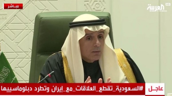 أعلن وزير الخارجية السعودي عادل الجبير، مساء الأحد، أن المملكة العربية السعودية قررت قطع العلاقات الدبلوماسية مع إيران، كما قررت طرد دبلوماسييها من المملكة. وابلغتهم بالمغادرة خلال 48 ساعة .
