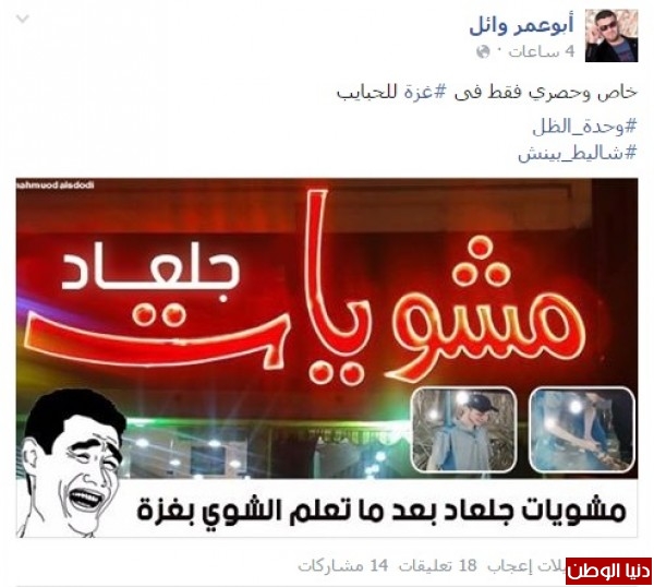 فعلق أحد المتابعين لموقع التواصل الاجتماعي "فيس بوك" بشكل ساخر أنه رأى أحد الجنود الإسرائيليين يبيع "الفلافل" في أحد المحال الغزية وهناك احتمال أن يكون الأسير الإسرائيلي المختفي حتى اللحظة شاؤول أرون.