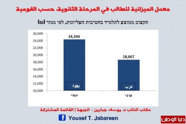 وكان مركز الأبحاث والمعلومات التابع للكنيست قد كشف بناء على طلب تقدم به النائب جبارين عن فارق جدي بتخصيص الميزانيات بين الطلاب العرب واليهود في المرحلة الثانوية يصل إلى ستة آلاف شاقل لكل طالب. وقد تم استعراض نتائج البحث في جلسة اللوبي البرلماني للنهوض بالتعليم العربي الذي يرأسه النائبان جبارين وغنايم قبل بضعة اسابيع في الكنيست، وقد ادعت وزارة المعارف في تعقيبها في حينه على هذه المعطيات أن سبب الفوارق يعود إلى أسباب مثل أقدمية المعلمين والاستكمالات والتخصصات المختلفة للطلاب الثانويين.