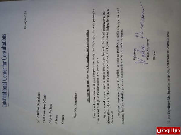 وجه وديع أبونصار، مدير المركز الدولي للاستشارات، رسالة صباح اليوم إلى ديميتريوس غريغوريانيس، رئيس شركة "ايجيان" للطيران، التي تتخذ من العاصمة اليونانية أثينا مقرا لها، اشتكى فيها على ما وصفه "بالعمل المعيب" الذي ارتكبته "ايجيان" عندما أنزلت من إحدى طائراتها مسافرين عربيين استجابة لمطالب مسافرين يهود.