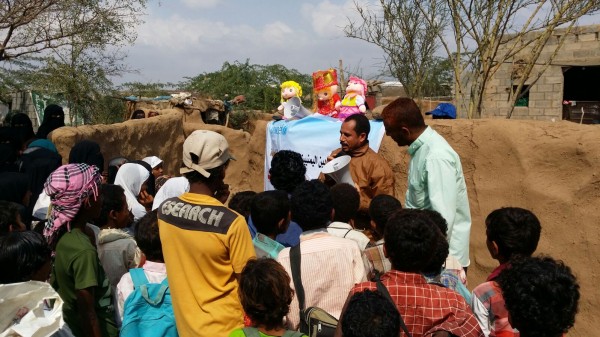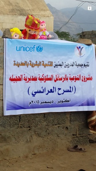 في اطار برنامج التوعية بالرسائل السلوكية، نفذت اليوم جمعية المدربين اليمنيين المسرح العرائسي بمديرية الحجيلة بمحافظة الحديدة (غربي اليمن)، والممول من منظمة اليونيسف.