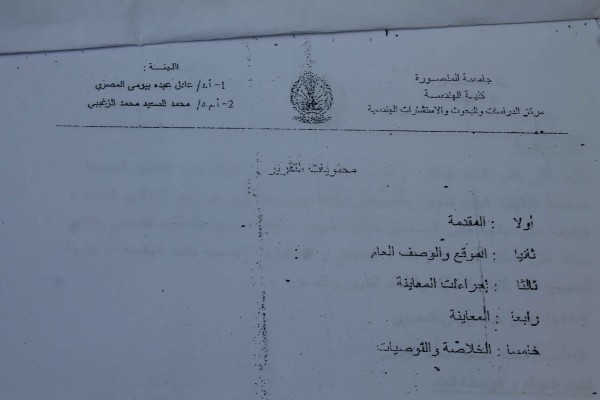 يشار إلى أن اللجنة التى تم تشكليها من كلية الهندسة جامعة المنصورة بفحص المستشفى أوصت بضرورة سرعة إتخاذ اللازم نحو معالجة جذرية للعيوب الموجودة بوصلات مواسير المياه والصرف الصحى وغرف التفتيش وعيوب عزل الرطوبة ونرى أن يتم ذلك بإزالة بلاط الأرضيات بالحمامات ودورات المياه ونظافة ما يعلو السقف الخرسانى وعزله بعد علاج ما يكون قد تأثر من الخرسانات أسفل طبقة البلاط ومراجعة جميع وصلات المواصير وإعادة التبليط مرة أخرى
