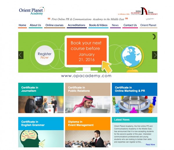 كشفت "أكاديمية أورينت بلانيت" (Orient Planet Academy)، أول أكاديمية إلكترونية للعلاقات العامة والاتصالات التسويقية في منطقة الشرق الأوسط، عن جدول مواعيد التسجيل والانتساب إلى الدورات التدريبية المقررة خلال الربع الأوّل من العام الجاري.