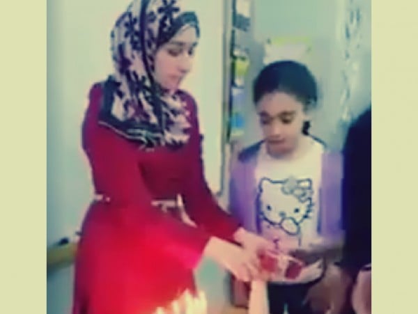 ويظهر الفيديو، الذي نشرته صفحة «إليكِ» على موقع «فيس بوك» مُعلمة شامية وضعت أمامها على المكتب عددًا من الشموع كرمز لـ«الصراط» قبل أن تقوم بنفخ قفاز مطاطي معتبراه رمزًا لشخص ليس بداخله «نور الإيمان»، ليرى الأطفال أن إذا عبر هذا الشخص على الصراط سيحترق، عندما انفجر القفاز فوق النار.