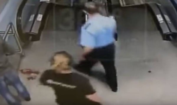 فيديو| مراهقتان تسحلان مشردا على سلم كهربائي