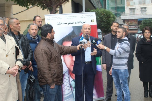 وقد ألقى الأستاذ عمر زين كلمة المنظمة العربية لحماية الصحفيين كلمة أكد فيها على حق الصحفيين والإعلاميين في تغطية الأحداث التي تدور في فلسطين وأن الأسير القيق هو أسير الكلمة الحرة وأسير الحق والحرية وأنه مقاوم يجابه العدو بصوته وكلمته داعياً كل الإعلاميين والصحفيين للتحرك نصرة للصحفي الأسير محمد القيق، كما ألقى الدكتور ناصر حيدر الحملة الأهلية لمناصرة فلسطين وقضايا الأمة مركزاً على واجب الأمة العربية والإسلامية في الدفاع عن فلسطين وإعلامييها وصحفييها الذين ينقلون للعالم معاناة الفلسطينيين وإنهاكات اسرائيل بحقهم.