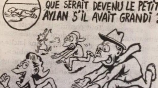 الرسم الكاريكاتيري الذي نشرته الصحيفة الفرنسية، والذي جاء بعنوان "المهاجرون"، وصف إيلان (3 سنوات) بأنه كان سيصبح متحرشاً بالنساء الألمانيات إذا لم يمت، وذلك بعد اعتداءات جنسية وقعت في مدينة كولونيا الألمانية ليلة رأس السنة.