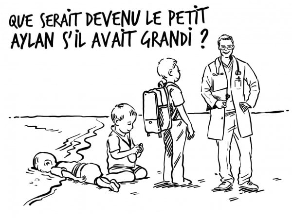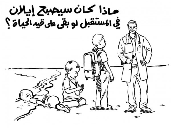 نشرت الملكة رانيا العبدالله، الجمعة، رسماً كاريكاتيرياً من فكرتها على حسابيها الرسميين على "تويتر" و"فيسبوك"، كتب عليه جملة تم ترجمتها إلى اللغة الفرنسية والإنجليزية والعربية، تقول "ماذا كان سيصبح إيلان في المستقبل لو بقي على قيد الحياة؟". وعلقت الملكة رانيا على حسابيها بالقول "كان من الممكن أن يصبح إيلان طبيباً أو معلماً أو أباً حنوناً".