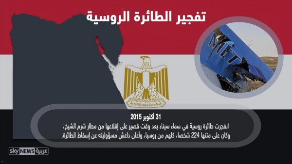 ومع نهاية الشهر، انفجرت طائرة روسية في سماء شبه جزيرة سيناء، بعد وقت قصير على إقلاعها من مطار منتجع شرم الشيخ، وكان على متنها 224 شخصا، وأعلن التنظيم مسؤوليته عن "إسقاط الطائرة".