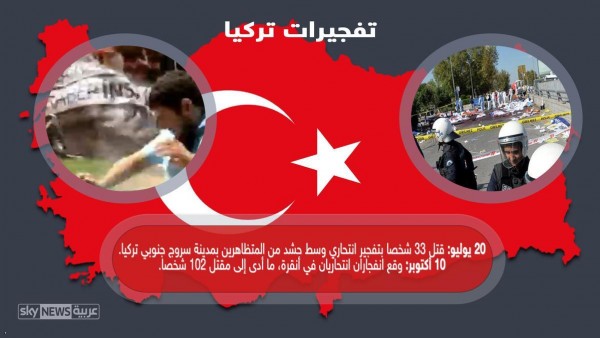 وفي 20 يوليو، فجر شخص نفسه وسط حشد من المتظاهرين في مدينة سروج بالقرب من الحدود التركية السورية، وأسفر التفجير عن مقتل 32 شخصا.