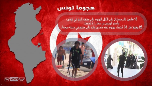 وفي 26 يونيو، قتل 38 شخصا، معظمهم من السائحين البريطانيين في هجوم نفذه شخص واحد على منتجع في منتجع سوسة في تونس.