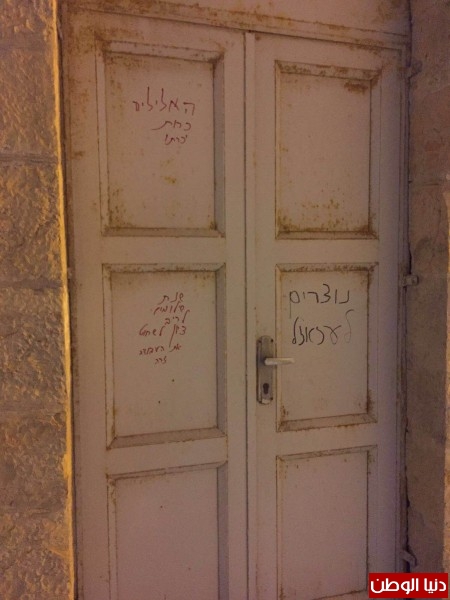 في عمل تخريبي وعنصري جديد ضد المسيحيين في القدس, كُتِبت عبارات باللغة العبرية الليلة الماضية على جدران وأبواب " رقاد العذراء " ( الدورميتسيون, على جبل صهيون في القدس ) ضد السيد المسيح وداعية أيضا لذبح المسيحيين وارسالهم الى جهنم .