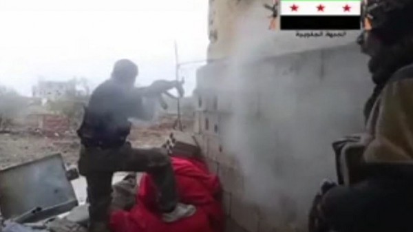 ويبين الفيديو الذي نشره مسلحون كيف أن أحد المسلحين يقوم بإطلاق النار من زاوية حائط فيما الآخر مختبئ وراءه في العمق بين حائطين، وفجأة تصطدم إحدى الطلقات بالحائط وتنعكس باتجاه فمه مباشرة. وبعد ذلك يفر الإثنان الى داخل المبنى.