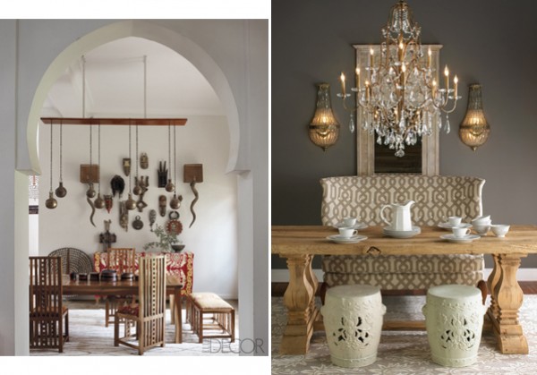 الطراز المغربي جذاب جداً ويمكن ان نستعين به في اي غرفة.يمكنك انشاء غرفة باكملها فقط بالطراز المغربي او اضافة بعض العناصر واللمسات التي من شانها ان تعطيك بالشعور بالستايل المغربي من حولك.وهنا بعض العناصر الاساسية للستايل المغربي في غرفة الطعام.