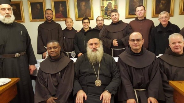 في مبادرة اخوية تأتي في أسبوع الصلاة من اجل وحدة الكنائس قام اليوم سيادة المطران عطا الله حنا رئيس اساقفة سبسطية للروم الارثوذكس يرافقه قدس الارشمندريت ملاتيوس بصل رئيس دير القديسة حنة في القدس بزيارة اخوية الى دير الاباء الفرنسيسكان بالقرب من كنيسة القيامة حيث كان هنالك لقاء محبة اخوي مع رهبان الدير وتم تقديم التهنئة للاب فادي شلوفي بمناسبة الذكرى السنوية التاسعة لرسامته الكهنوتية . تحدث في هذا اللقاء الذي تخللته مائدة محبة سيادة المطران عطا الله حنا والاب ملاتيوس بصل والاب فادي شلوفي وكذلك عدد من رهبان الدير . اتسم اللقاء بطابع الاخوة والمحبة الصادقة والكلمات المعبرة عن الرغبة بمزيد من التلاقي والتعاون والتفاهم بين الكنائس المسيحية في القدس