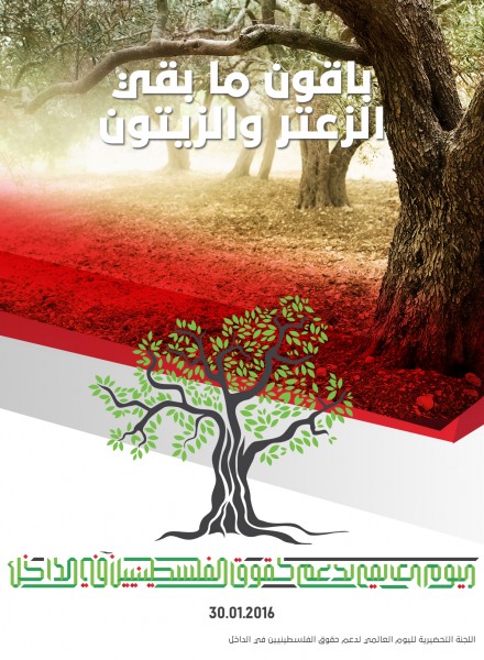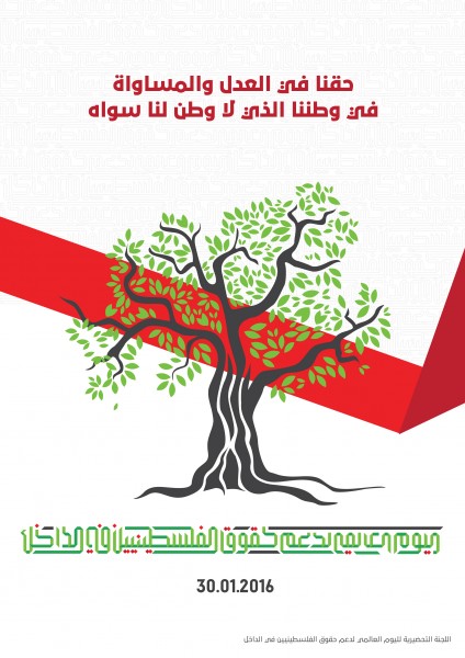 في اعقاب تراكم الحملات القمعية وتنامي العنصرية الرسمية وغير الرسمية وفي اعقاب تضييق الهامش الديموقراطي الضيق اصلا وفي اعقاب الموجات المتلاحقة لمصادرة الارض العربية وفي اعقاب تضييق الحياة والحركة ضد ابناء جماهيرنا العربية الفلسطينية الذين يحملون المواطنة الاسرائيلية, من جهة وعلى خلفية التضليل التي تقوم بها الحكومة الاسرائيلية بشأن الطبيعة الديموقراطية للنظام والسياسة الاسرائيلية من جهة اخرى, وبعد مشاورات واسعة داخل لجنة المتابعة العليا للمواطنين العرب في اسرائيل والتي تضم كل الاحزاب الفاعلة بين جماهيرنا وكل النواب العرب في الكنيست الذين يمثلوننا وكل رؤساء البلديات والمجالس المحلية المنتخبة والغالبية الساحقة من مؤسسات المجتمع المدني, وبعد مشاورات مع مختلف الاطياف والفصائل التي تمثل شعبنا الفلسطيني عموما , خرجنا بنداء يدعو مختلف الاوساط الفلسطينية والعربية والدولية الى تنظيم فعاليات لمساندة ودعم حقوق جماهيرنا الفلسطينية في الجليل والمثلث والنقب والساحل في يوم واحد اطلقنا عليه اسم : اليوم العالمي لدعم حقوق الفلسطينيين في الداخل (في اسرائيل) وذلك يوم السبت 30-1-2016.