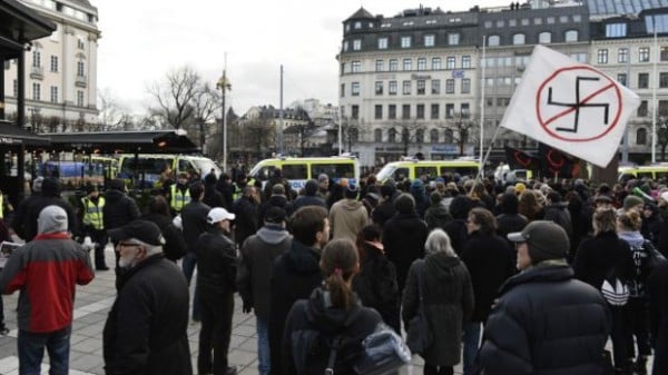 تجمع حوالي 100 رجل ملثم، يرتدون ملابس سوداء، في وسط العاصمة السويدية ستوكهولم لمهاجمة المهاجرين، حسبما تقول تقارير.