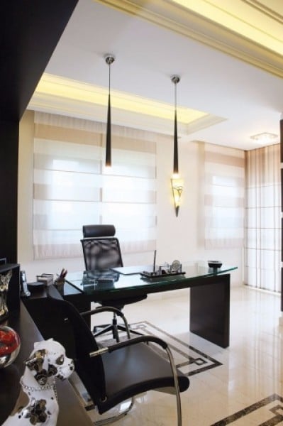وفي هذا الطابق مكتب للمالك صمّمه المهندس بحرفية عالية، حيث جمع الزجاج الشفاف والخشب في لوحة فنية متكاملة وعصرية.