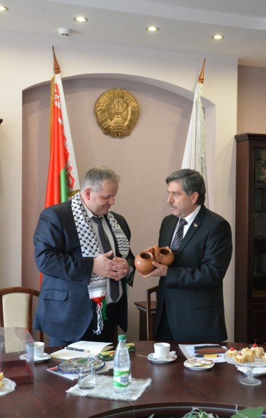 التقى سفير دولة فلسطين لدى جمهورية بيلاروسد. خالد عريقات برئيس جامعة الثقافة الحكومية البيلاروسية يوري بافلفيتش بوندر،رئيس جمعية الصداقة البيلاروسية – الفلسطينية بالإضافة إلى مسؤول العلاقاتالخارجية في الجامعة السيد فاديم فاتتشسلاففيتش كريشتانوسوف ، والسيد الكسندرأنتوليفيتش فيليبف عميد التعليم الإضافي، وإضافة إلى المستشار في السفارة د. فريدشعلان .