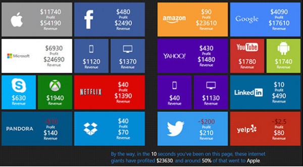أما أقرب منافس لابل، شركة مايكروسوفت فلا تكسب في اللحظات العشر سوى 6900 دولاراً، أكثر من غوغل التي تكسب في اللحظات نفسها، 4 آلاف دولار.