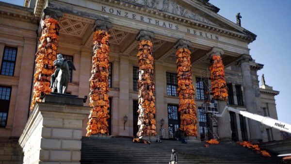 وفي عمله الفني، استخدم الفنان ويوي سترات النجاة لتغطية أعمدة مسرح كنزرثيوس في برلين برفقة فريقه لتسليط الضوء على محنة مئات الآلاف من اللاجئين الذين يحاولون الوصول إلى أوروبا كل يوم عن طريق البحر من تركيا.
