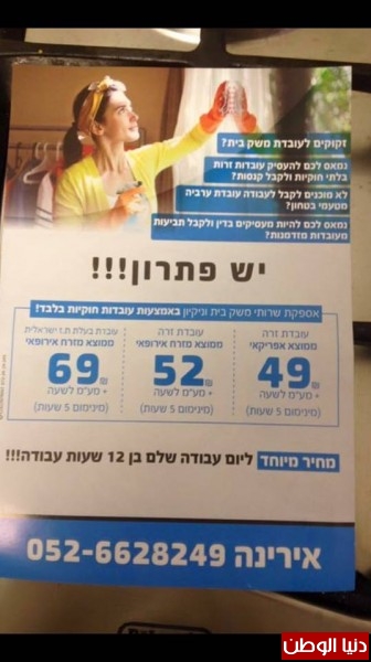 انتشر في الآونة الأخيرة في العالم الافتراضي وعدة مواقع إعلانًا إسرائيليًا يقدم خدمات تنظيف للزبائن مفصلا أسعار الخدمات بصورة عنصرية مستفزة، حيث أشار الإعلان إلى أنّ سعر العاملة من أصول افريقية يبلغ 49 شيكلا للساعة فيما يبلغ سعر العاملة من أصول أوروبية 52 شيكلا للساعة، في حين لم يوّضح الإعلان فرق الأسعار علمًا أنّ في الحالتين ستقدم العاملة ذات الخدمات.