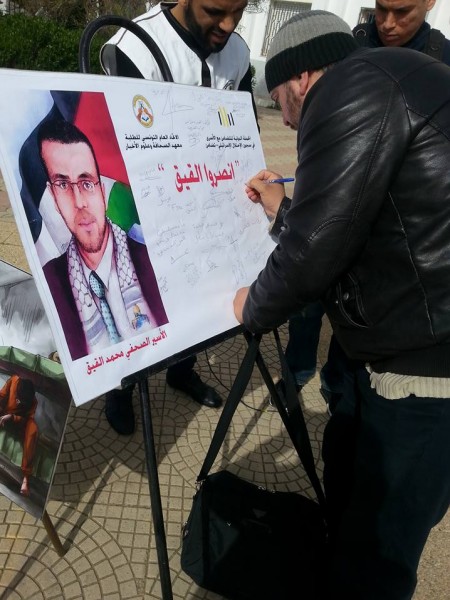 نظمت الحملة الدولية للتضامن مع الأسرى في سجون الإحتلال الإسرائيلي "تضامن" والإتحاد العام التونسي للطلبة بمعهد الصحافة وعلوم الأخبار في تونس العاصمة يوم الإربعاء 17 شباط وقفة تضامنية مع الأسير الصحفي محمد القيق المضرب عن الطعام منذ 84 يوماً تحت شعار " انصروا القيق".
