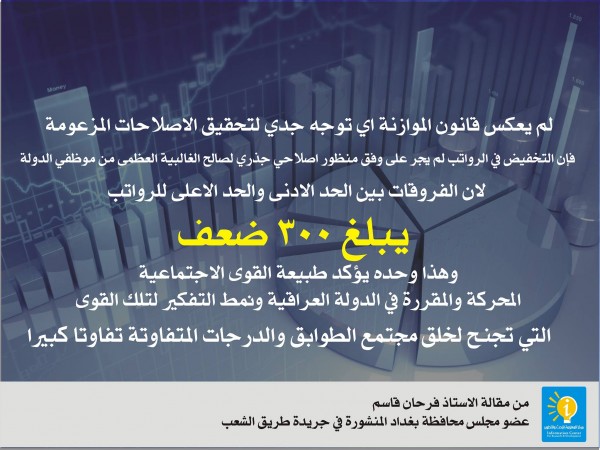 وبحسب الجهاز المركزي للإحصاء فأن قرابة الـ 20% من العراقيين يعيشون تحت خط الفقر، وان نسب الفقر في الريف أكثر من المدينة، وهذه النسبة قابلة للزيادة في ظل الظروف الحالية والأزمة الاقتصادية التي يمر بها العراق مع انخفاض أسعار النفط بالإضافة إلى الوضع الأمني المتردي وتصاعد أعداد النازحين إلى أكثر من ثلاثة ملايين نازح، وانتشار الفساد في كافة مفاصل الدولة، وسيطرة مجموعة من المتنفذين والمقربين منهم على ثروات البلد، ومن جهة أخرى لا توجد إلى الآن أي تدابير حقيقية من قبل الحكومة لاحتواء هذه المشكلة, وما زالت حلولها توقيعية حيث لم يشهد العراق طيلة السنوات الثلاثة عشر الماضية أي مشاريع تنموية، أو رؤى اقتصادية واقعية للحد من الفقر والعمل من اجل تحقيق العدالة الاجتماعية، بل العكس من ذلك حيث لا تزال مخصصات ورواتب المسؤولين تشكل نسبة كبيرة من ميزانية الدولة، ولا زال الاعتماد بشكل شبه كلي على مردودات النفط فقط، وهو الآخر يشهد تراجعا كبيرا في أسعار بيعه، وفي مقالة نشرت قبل فترة حول الميزانية عكست هشاشة الاقتصاد العراقي بسبب السياسات الاقتصادية الخاطئة كما بينت في واحدة من نقاطها (بأنها لم تعكس أي توجه جدي لتحقيق " الإصلاحات " المزعومة . فان التخفيض في الرواتب لم يجر على وفق منظور أصلاحي جذري لصالح الغالبية العظمى من موظفي الدولة، لان الفروقات " بين الحد الأدنى والحد الأعلى للرواتب يبلغ 300 ضعف، وهذا وحده يؤكد طبيعة القوى الاجتماعية المحركة والمقررة في الدولة العراقية ونمط التفكير لتلك القوى التي تجنح لخلق مجتمع الطوابق والدرجات المتفاوتة تفاوتا كبيرا .)