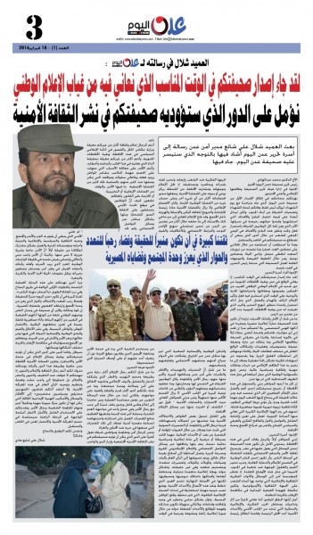 استنكر مدير أمن عدن إدعاء الصحيفة المسماة بـ (عدن اليوم) بأنه وجه لها رسالة يُشيد فيها بدورها ويتحدث عن إصدارها والمنتظر منها ... إلخ .