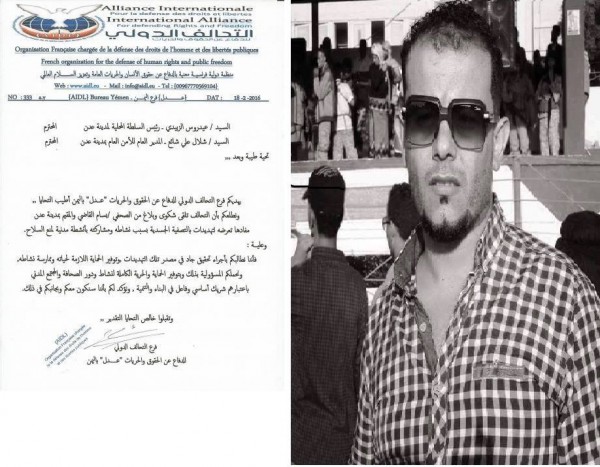 وطالب التحالف الدولي للدفاع عن الحقوق والحريات ومقره الرئيسي فرنسا في رسالته موجهة لقيادة عدن بأجراء تحقيق جاد في مصدر تلك التهديدات , وتوفير الحماية اللازمة لحياة الصحفي القاضي ولممارسة نشاطه ,.