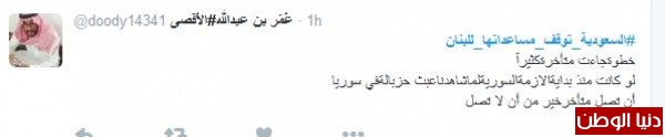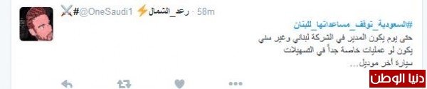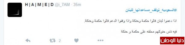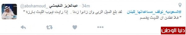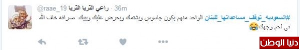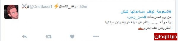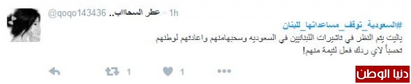 على تويتر دشّن مغرّدون من السعودية هاشتاج "#السعوديه_توقف_مساعداتها_للبنان"، للوقوف بجانب المملكة في قراراتها ضد "لبنان"، ومطالبة المملكة بمزيد من العقوبات على "حزب الله" حتى انهاء الحزب وعودة لبنان للحضن العربي بحسب ما وصف المغرّدون .