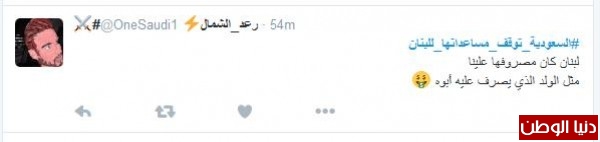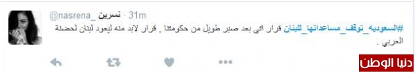 نسرين غرّدت : "#السعوديه_توقف_مساعداتها_للبنان قرار اتى بعد صبر طويل من حكومتنا , قرار لابد منه ليعود لبنان لحضنة العربي" ، أما عبدالعزيز النغيمشي فغرّد: "#السعوديه_توقف_مساعداتها_للبنان لقد بلغ السيل الزبى وان زادوا زدنا . إذا رايـت نيـوب الليـث بـارزة " " فـلا تظنـن ان اللـيـث يبتـسـم".