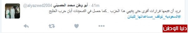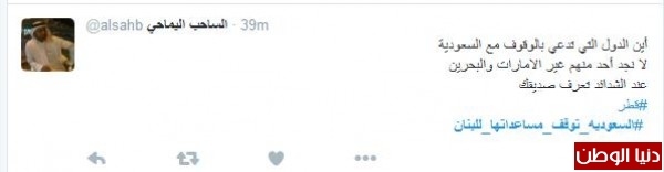 الساحب اليماحي غرّد : "أين الدول التي تدعي بالوقوف مع السعودية لا نجد أحد منهم غير الامارات والبحرين، عند الشدائد تعرف صديقك" أما أبو وطن محمد الحصيني فغرّد : "نريد أن تتبعها قرارات أقوى حتى ينتهي هذا الحزب ..كما حصل في التسعينات آبان حرب الخليج"