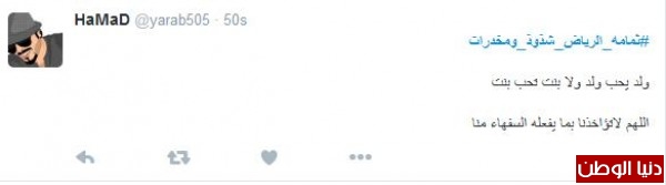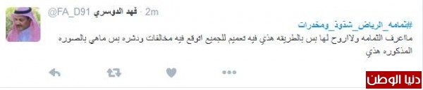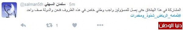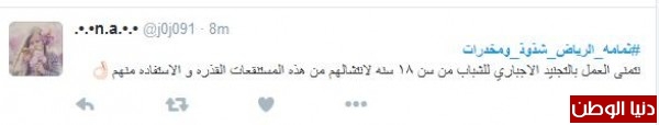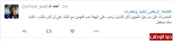 فهد غرّد : "#ثمامه_الرياض_شذوذ_ومخدرات ياخي شي يقهر جنودنا يقاتلون ويتعبون ويجي حثالة هالمجتمع بكل برودة يشوهون سمعتنا مخدرات ورقص م اقول الا لعنة الله." وغرّد آخر : "المشاركة في هذا الهشتاق حتى يصل للمسؤولين واجب وطني خاص في هذه الظروف فنحن والدولة صف واحد #ثمامه_الرياض_شذوذ_ومخدرات"