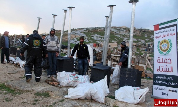 بأجسادهم الصغيرة التي كانت ترتجف من شدة البرد، راح أطفال أحد التجمعات البدوية في منطقة الزعيم شرقي مدينة القدس، يتسابقون في سبيل الحصول على المساعدات العينية المتنوعة التي قدمتها هيئة الأعمال الخيرية الإماراتية لتلك التجمعات، في إطار حملة "بسمة شتاء في فلسطين".